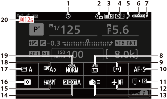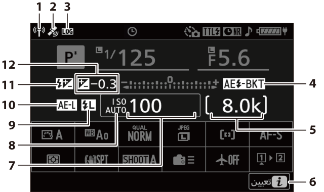 سرعة الغالق (S (غالق-أولوية تلقائية)، M (يدوي)) قيمة تعويض التعريض الضوئي (تعويض التعريض الضوئي) قيمة تعويض الفلاش (تعويض الفلاش) عدد اللقطات في تسلسل تصحيح التعريض الضوئي (تصحيح التعريض الضوئي والفلاش) عدد اللقطات في تسلسل تصحيح WB (تصحيح توازن البياض) الفواصل الزمنية المتبقية في تسلسل مؤقت الفاصل الزمني (تصوير فوتوغرافي بفاصل زمني) اللقطات المتبقية في تسلسل التركيز البؤري المتغير (تصوير فوتوغرافي بتركيز بؤري متغير) مؤشر سجل التعقب (بيانات الموقع) الوقت المتبقي للتعريض الضوئي (d6: سرعات الغالق الممتدة (M)) |