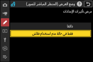 لا تظهر تأثيرات التغييرات على الإعدادات مثل توازن البياض وإعدادات برنامج التحكم بالصورة Picture Control وتعويض التعريض الضوئي في شاشة التصوير. يؤدي الضغط على 2 عند تظليل [] إلى عرض الخيارين [] و[].