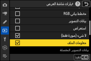 يمكن الآن استخدام [] (خيارات شاشة العرض) لإضافة [] إلى صفحات معلومات الصورة المتاحة أثناء عرض إطار كامل.