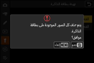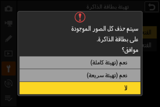 يؤدي تحديد فتحة تحتوي على بطاقة ذاكرة متوافقة لإجراء التهيئة باستخدام الإعداد [] في قائمة الإعداد إلى عرض مربع حوار يطالبك باختيار نوع التهيئة.
