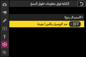 يؤدي توصيل الكاميرات البعيدة بالكاميرا الرئيسية الآن إلى استبدال معلومات حقوق النشر الموجودة على الكاميرات البعيدة تلقائيًا بمعلومات حقوق النشر المخزنة على الكاميرا الرئيسية. يمكنك تمكين الاستبدال من خلال تحديد [الاتصال بكاميرات أخرى] > [الكتابة فوق معلومات حقوق النسخ] في قائمة شبكة الكاميرا الرئيسية.