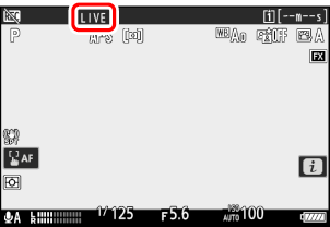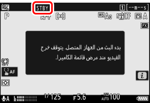 - ستظهر شاشة تصوير وضع الفيديو بغض النظر عن الإعداد المحدد لزر اختيار الصور/الفيديو. سيتم تطبيق إعدادات وضع الفيديو بما في ذلك توازن البياض وإعداد برنامج التحكم بالصورة Picture Control على صورة البث.