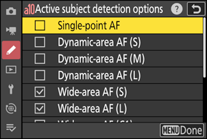 - Markér indstillinger, og tryk på J eller 2 for at vælge ( M ) eller fravælg ( U ). Motivdetektion er kun aktiveret, når en AF-metode markeret med et flueben ( M ) er valgt i autofokustilstand.