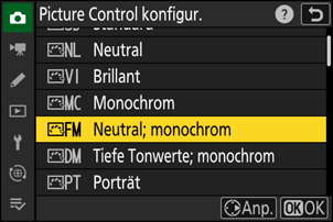 • [Neutral; monochrom] und [Tiefe Tonwerte; monochrom] wurden auch bei [Picture Control verwalten] im Fotoaufnahmemenü und Videoaufnahmemenü zu den Picture-Control-Konfigurationen, die den benutzerdefinierten Konfigurationen zugrunde liegen, hinzugefügt.