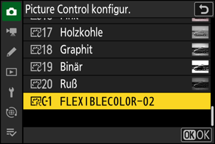 • Benutzerdefinierte Picture-Control-Konfigurationen, die auf [Flexible Farbe] basieren, lassen sich auf der Kamera nicht verändern oder umbenennen.