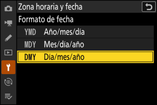 Marque el orden de visualización de la fecha deseado (año, mes y día) y pulse J.