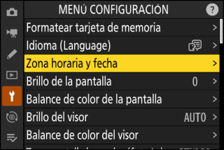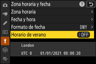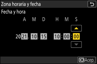 Pulse J después de usar el multiselector para ajustar el reloj a la fecha y hora de la zona horaria seleccionada en la pantalla [] (tenga en cuenta que la cámara usa un reloj en formato de 24 horas).