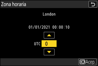 La pantalla mostrará las ciudades seleccionadas en la zona horaria elegida y la diferencia horaria entre la zona elegida y UTC.