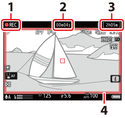 Se visualizará un indicador de grabación y los bordes de la pantalla de disparo se volverán rojos. La pantalla también muestra el tiempo restante o, en otras palabras, la cantidad aproximada de metraje nuevo que se puede grabar en la tarjeta de memoria.