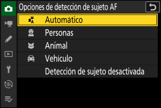 En el caso del menú de grabación de vídeo, la selección del sujeto se realiza mediante [] > []. Se pueden seleccionar tipos de sujeto independientes para los modos de foto y vídeo.