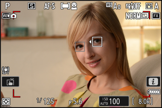 Los rostros humanos detectados por la cámara al seleccionar [] se identifican mediante un borde que muestra el punto de enfoque. Si la cámara detecta los ojos del sujeto, el punto de enfoque aparecerá en uno de sus ojos (AF de detección de rostros/ojos). Si el sujeto mira hacia otro lado después de detectar su rostro, el punto de enfoque se moverá siguiendo su movimiento.