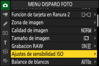 La sensibilidad ISO también puede ajustarse usando el elemento [] del menú disparo foto.