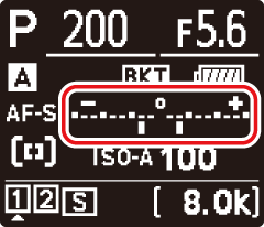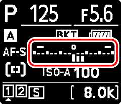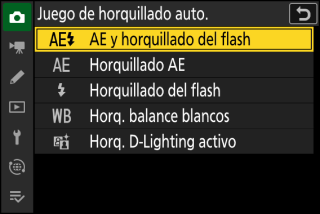 Al seleccionar [], la cámara modifica la exposición y el nivel del flash. Seleccione [] para variar solamente la exposición, [] para variar solamente el nivel del flash. Tenga en cuenta que el horquillado del flash está disponible en i‑TTL y, cuando sea compatible, solamente con los modos de control del flash de diafragma automático (qA) (Control del flash i‑TTL, Flashes compatibles).