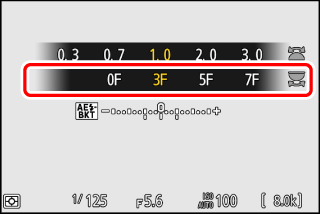 Mantenga pulsado el botón BKT y gire el dial secundario para seleccionar el incremento de la exposición.