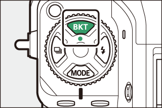 Los ajustes de la cámara indicados a continuación pueden restablecerse a los valores predeterminados pulsando los dos botones marcados con puntos verdes I (BKT y E) al mismo tiempo y manteniéndolos pulsados durante más de dos segundos (la pantalla de disparo y el panel de control se apagan brevemente mientras se restauran los ajustes).