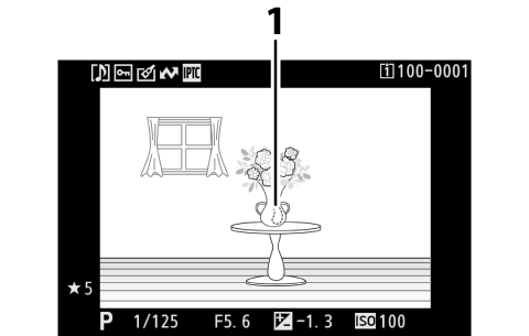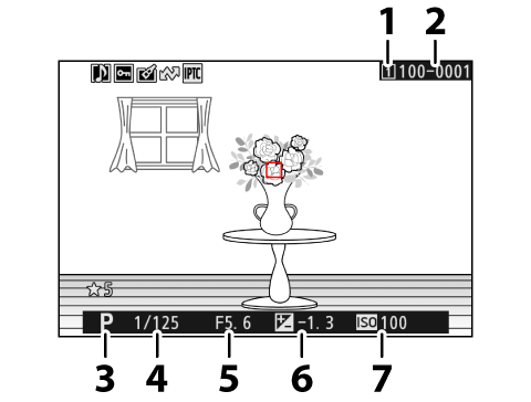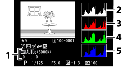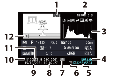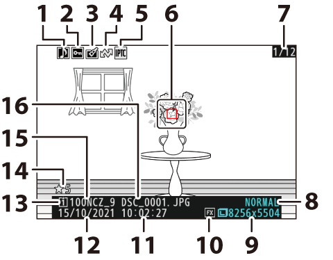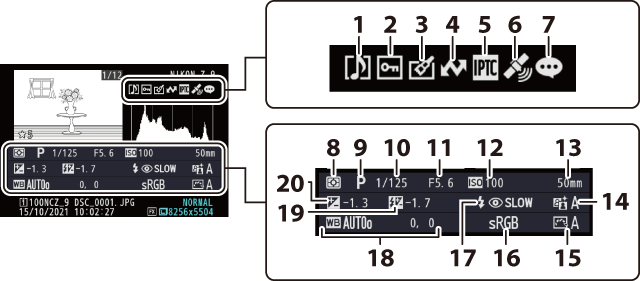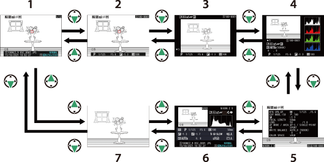 La información de la foto aparece superpuesta en las imágenes visualizadas durante el modo de reproducción a pantalla completa. Pulse 1, 3 o el botón DISP para desplazarse por la información de la foto tal y como se muestra a continuación.