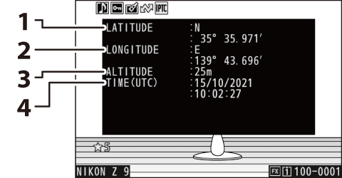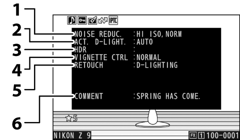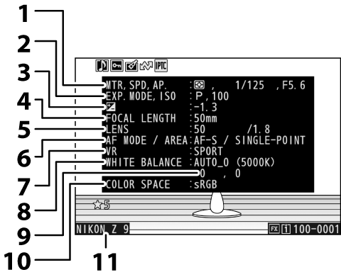 Consulte los ajustes efectivos en el momento de capturar la imagen. La lista de datos del disparo tiene varias páginas que se pueden ver pulsando 1 o 3. La información visualizada puede seleccionarse usando [] > [] en el menú de reproducción.
