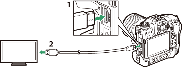 La cámara se puede conectar a televisores, grabadoras y otros dispositivos con conectores HDMI. Utilice un cable HDMI tipo A de terceros. Esta cable debe adquirirse por separado. Apague primero la cámara antes de conectar o desconectar un cable.