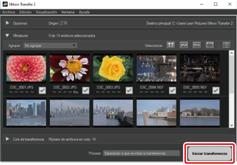 Se iniciará el componente NX Studio de Nikon Transfer 2. El software de transferencia de imágenes de Nikon Transfer 2 se instala como parte de NX Studio.