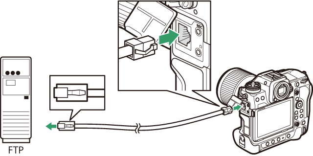 La cámara puede conectarse a servidores FTP directamente o a través de redes existentes usando un cable Ethernet de terceros introducido en el conector de Ethernet de la cámara.