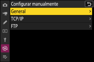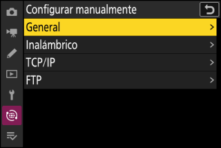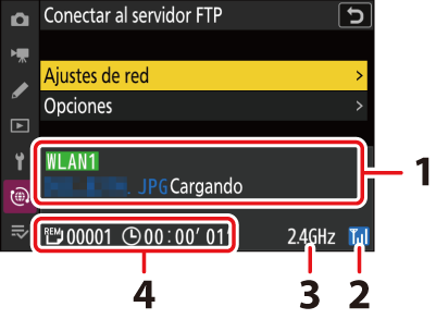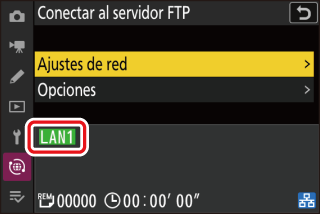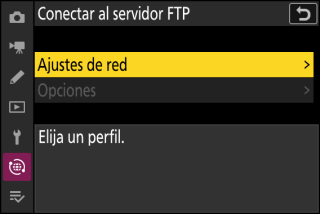 Antes de cargar imágenes, conecte el cámara y el servidor FTP a través de Ethernet o de una red inalámbrica. Realice la conexión usando un perfil de host seleccionado a través de la lista [] > [].