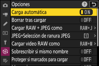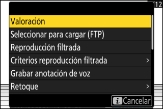 El elemento [] del menú de reproducción i puede usarse para visualizar únicamente las imágenes que cumplan con los criterios elegidos (Reproducción filtrada). Podrá seleccionar todas las imágenes para la carga marcando [] en el menú i y pulsando J.