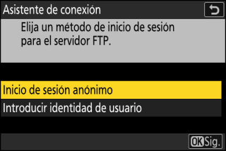 Seleccione esta opción si el servidor no requiere una identidad de usuario o contraseña. Esta opción solo se puede utilizar con servidores configurados para el inicio de sesión anónimo. Si el inicio de sesión tiene éxito, la cámara le pedirá que elija un destino.