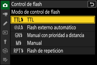 flash pueden configurarse usando el elemento [] > [] en el menú disparo foto. Los modos de control de flash disponibles varían con el