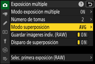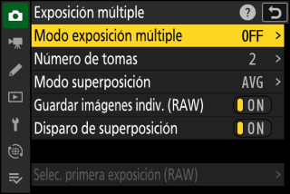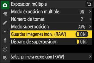 Para guardar tanto la exposición múltiple como las tomas que la componen, seleccione []; los disparos individuales se guardan en formato NEF (RAW). Para guardar solo la exposición múltiple, seleccione [].