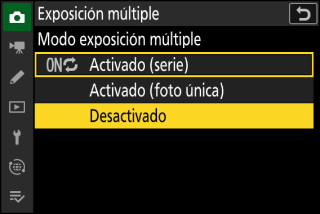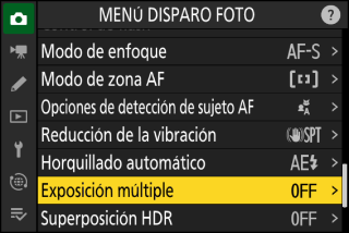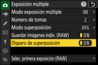 En los modos de disparo continuo, la cámara graba todas las exposiciones en una sola ráfaga. Si selecciona [], los disparos de exposición múltiple finalizarán después de grabar la primera exposición múltiple. Si selecciona [], se grabará una exposición múltiple adicional cada vez que pulse el disparador.
