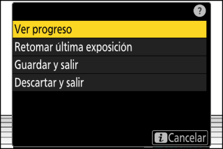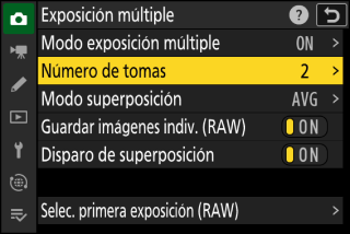 Si selecciona [], la cámara saldrá del modo de exposición múltiple una vez que el número de tomas seleccionado en el paso 3 haya sido realizado.