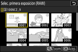 Para seleccionar la primera exposición de entre las fotos NEF (RAW) existentes, marque [] y pulse 2.