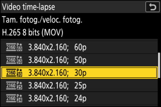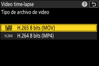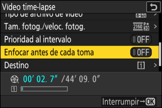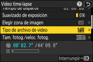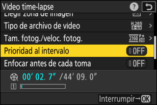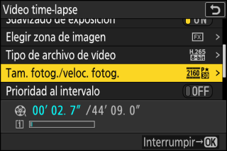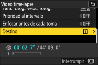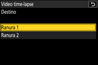 Marque la ranura que se utilizará para grabar vídeos time-lapse cuando haya dos tarjetas de memoria introducidas y pulse J.