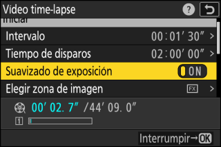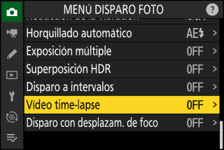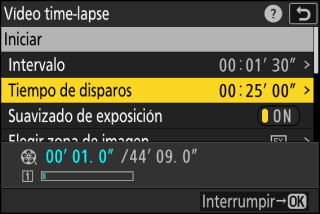 Los disparos podrían finalizar al usar los controles de la cámara, al modificar los ajustes o al conectar un cable HDMI. Se creará un vídeo con los fotogramas grabados hasta el momento en el que finalizaron los disparos.