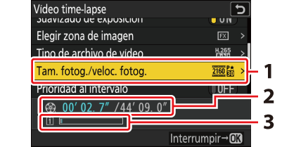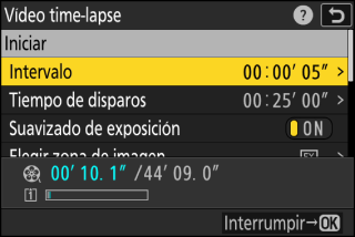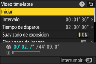 Inicie la grabación time-lapse. Los disparos comienzan transcurridos aproximadamente 3 seg. y continúan en el intervalo seleccionado para [] durante el tiempo seleccionado en []. |