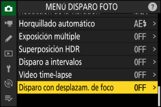 Cambiar los ajustes de la cámara mientras la fotografía con desplazamiento de foco está en curso podría ocasionar que el disparo finalice.