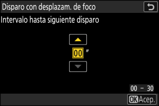 Si está usando un flash, seleccione un intervalo superior al tiempo necesario para la carga del flash. Si el intervalo es demasiado corto, el flash podría dispararse a una potencia inferior a la necesaria para la exposición completa.
