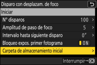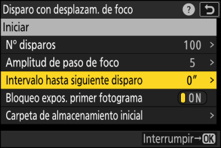La cámara toma fotografías en el intervalo seleccionado, comenzando a la distancia de enfoque seleccionada al inicio de los disparos y avanzando hacia el infinito por la distancia de paso de enfoque seleccionada con cada toma.