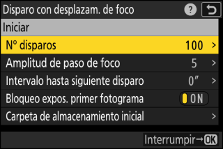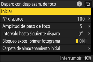 Comience los disparos. La cámara realizará el número de tomas seleccionado, cambiando la distancia de enfoque por la cantidad seleccionada con cada toma. |