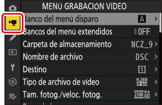Para ver el menú de grabación de vídeo, seleccione la ficha 1 en los menús de la cámara.