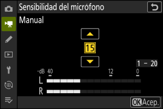 Ajuste la sensibilidad del micrófono manualmente. Elija entre los valores de [] a []. Cuanto más alto sea el valor, mayor será la sensibilidad; cuanto más bajo sea el