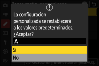 Puede restaurar los ajustes predeterminados de un banco de configuraciones personalizadas seleccionado. Para hacerlo, marque el banco y pulse O (Q); se mostrará un cuadro de diálogo de confirmación. Marque [] y pulse J para restaurar los ajustes predeterminados del banco seleccionado.