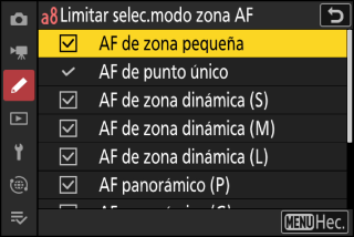 Seleccione los modos de zona AF que pueden seleccionarse pulsando el botón de modo de enfoque y girando el dial secundario.