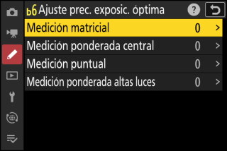 La configuración personalizada b6 [] ajusta con precisión la exposición independientemente para cada banco de configuraciones personalizadas. Tenga en cuenta los distintos valores del ajuste de precisión para la configuración personalizada b6 al cambiar los bancos.
