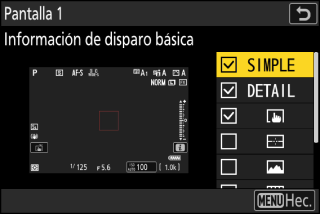Seleccione las visualizaciones de la pantalla accesibles pulsando el botón DISP durante los disparos.