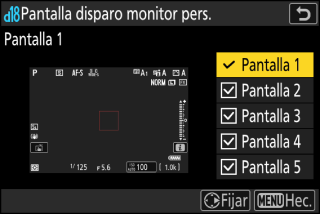 Marque los elementos (de [] a []) y pulse J para seleccionar (M) o anular la selección (U). Únicamente se puede acceder a las pantallas marcadas con una marca de verificación (M) pulsando el botón DISP durante los disparos. [] no se puede deseleccionar.