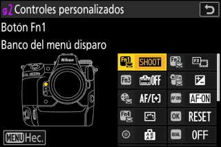 Pulse el control y gire un dial de control para seleccionar un banco del menú de disparo. |