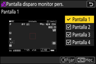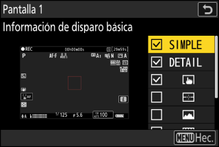Marque los elementos (de [] a []) y pulse J para seleccionar (M) o anular la selección (U). Únicamente se puede acceder a las pantallas marcadas con una marca de verificación (M) pulsando el botón DISP durante los disparos. [] no se puede deseleccionar.