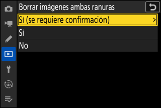 Elija si borrar una copia de una imagen grabada en ambas tarjetas de memoria con [] o una opción de formato doble ([] o []) seleccionada para [] en el menú de disparo foto también elimina la copia restante.