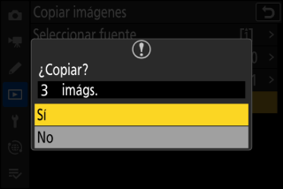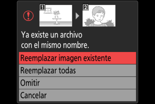 Si la carpeta de destino contiene un archivo con el mismo nombre que el de una de las imágenes a copiar, se mostrará un cuadro de diálogo de confirmación. Seleccione [] o [] para reemplazar el archivo o archivos existentes. Los archivos protegidos de la carpeta de destino no serán sustituidos. Seleccione [] para continuar sin reemplazar los archivos existentes. Seleccione [] para salir sin copiar más imágenes.